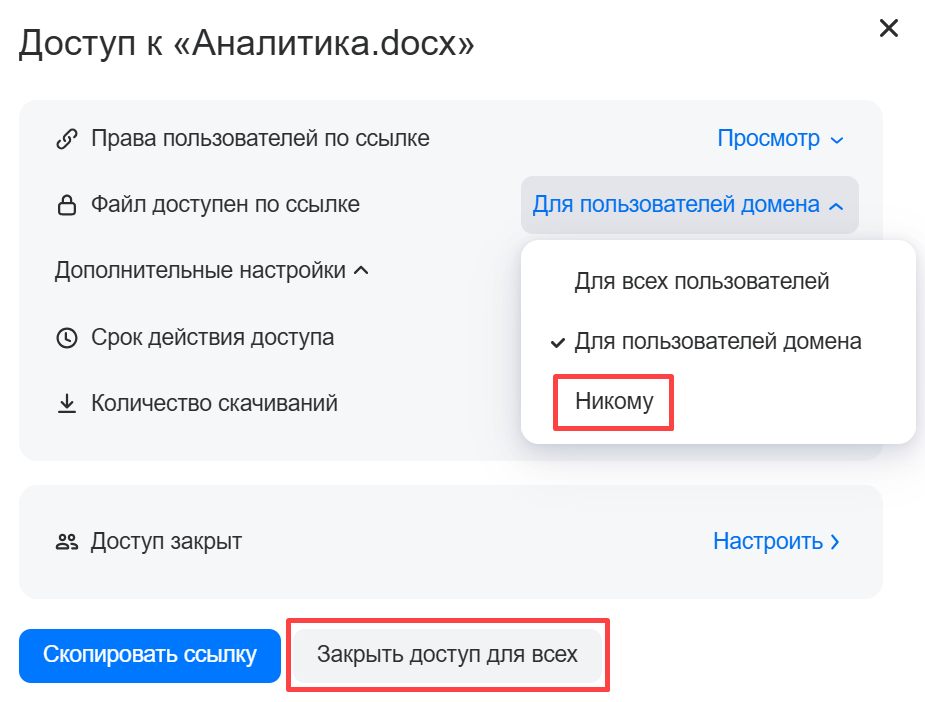 - Либо в строке Файл доступен по ссылке установите значение Никому и подтвердите выбор.