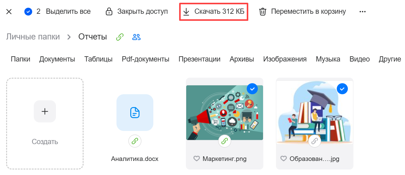 Чтобы скачать несколько файлов сразу, зажмите клавишу Shift или Ctrl на клавиатуре и выделите нужные файлы. Затем нажмите Скачать в верхнем меню.