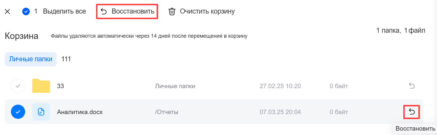 Удаленные файлы перемещаются в папку «Корзина» и хранятся там 14 дней с момента удаления. Чтобы восстановить файлы и папки: