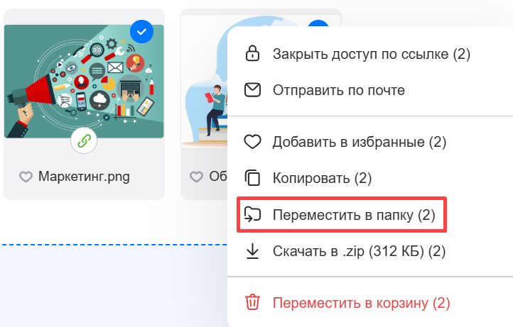 Чтобы переместить файл, наведите курсор на файл, нажмите правую кнопку мыши и выберите Переместить в папку (если нужно переместить несколько файлов сразу, выделите их, зажав клавишу Shift или Ctrl на клавиатуре).