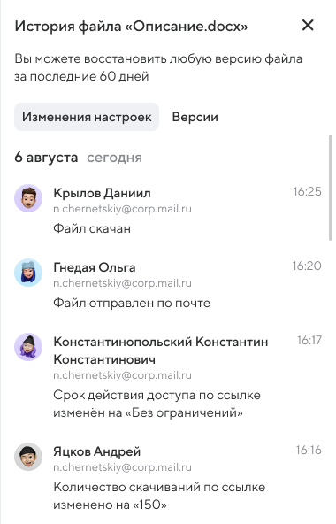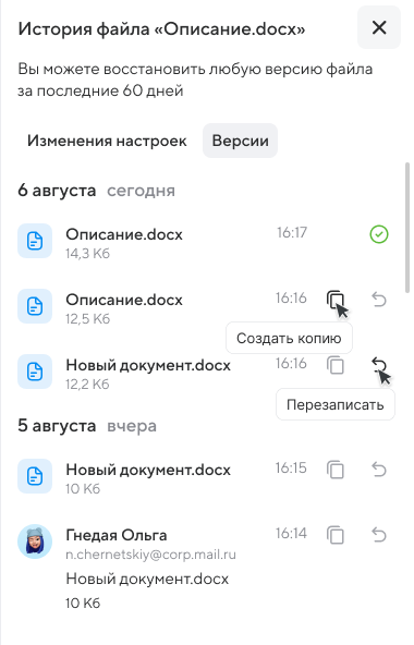 В истории показаны все последние сохраненные версии файла, а также изменения настроек, связанные с файлом или папкой. Вы можете перезаписать или создать копию файла нужной версии.