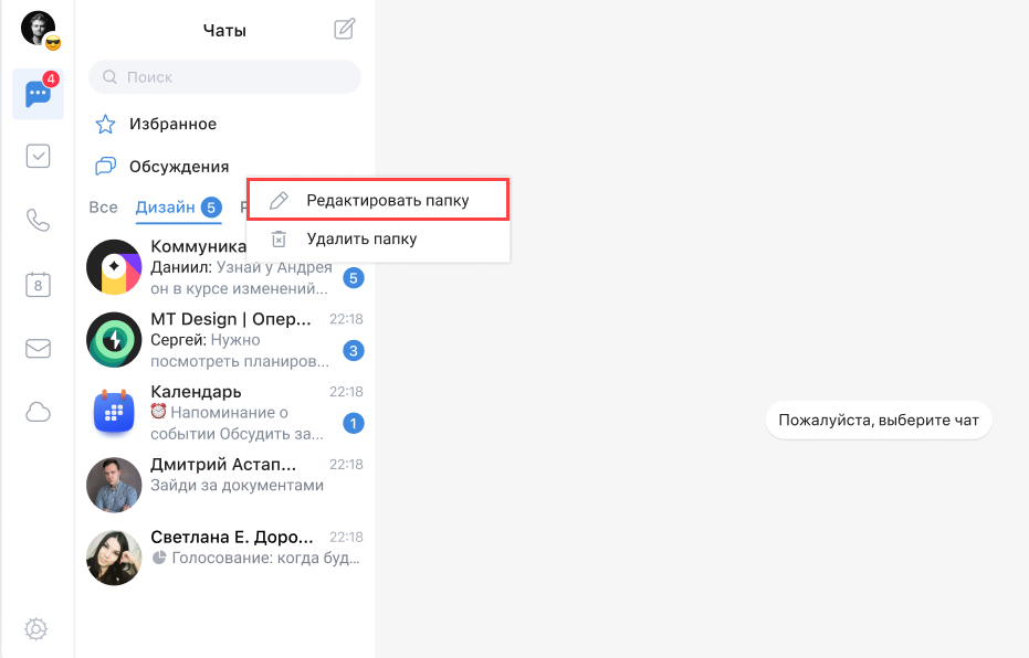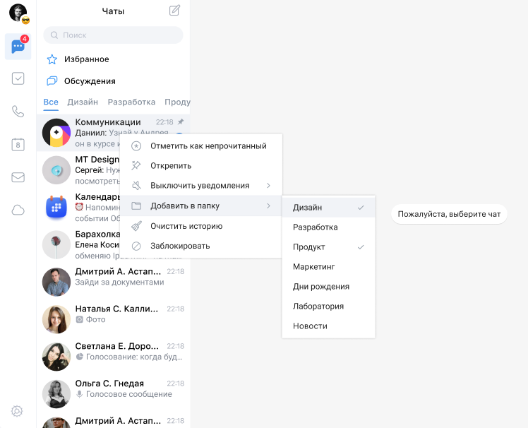 Чтобы добавить чат в папку, нажмите на чат правой кнопкой мыши, выберите пункт Добавить в папку и выберите необходимые папки. Возможен выбор нескольких папок из списка: