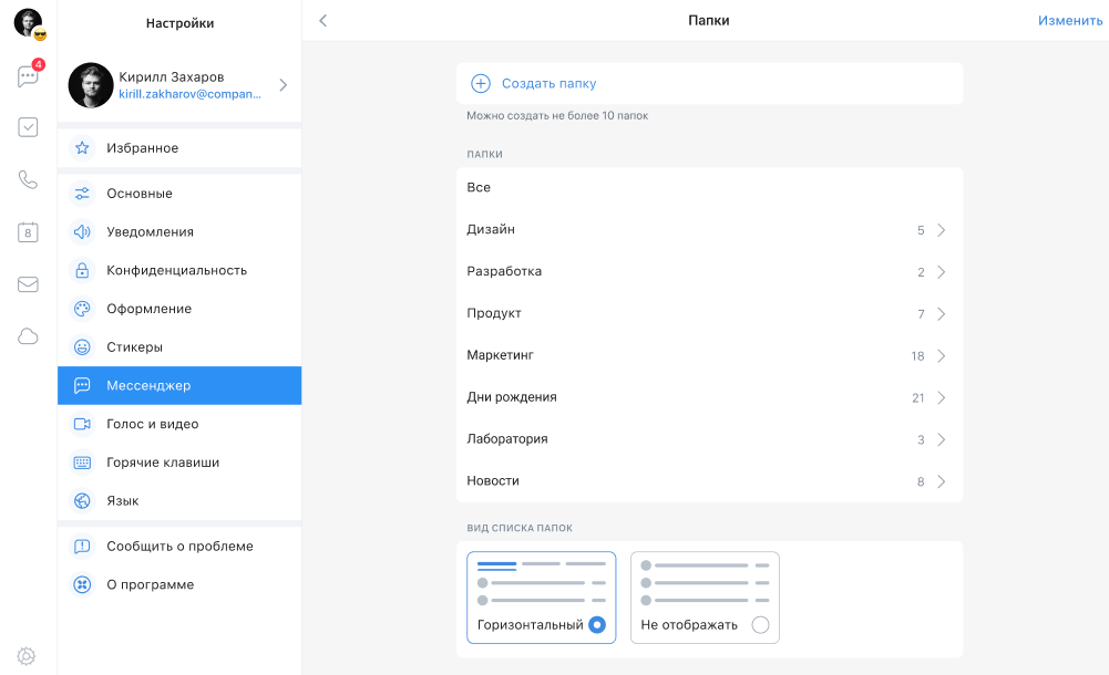 либо перейдите в меню Настройки –> Мессенджер –> Папки и нажмите на кнопку Создать папку: