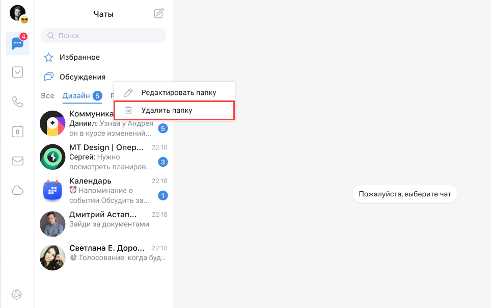 - контакты (в том числе тех, с которыми еще нет чата) — при создании чата с контактом он сразу будет отображаться в нужной папке;