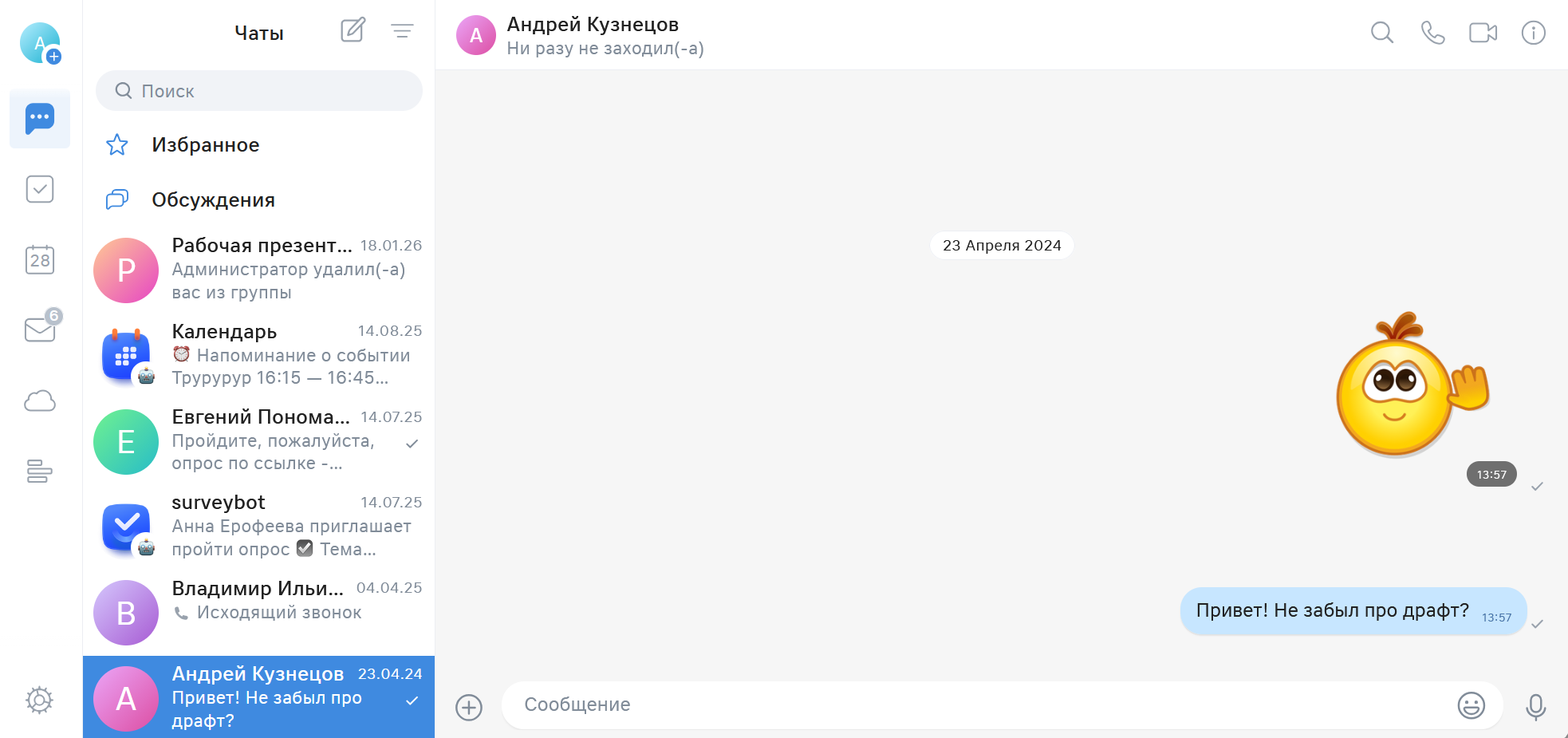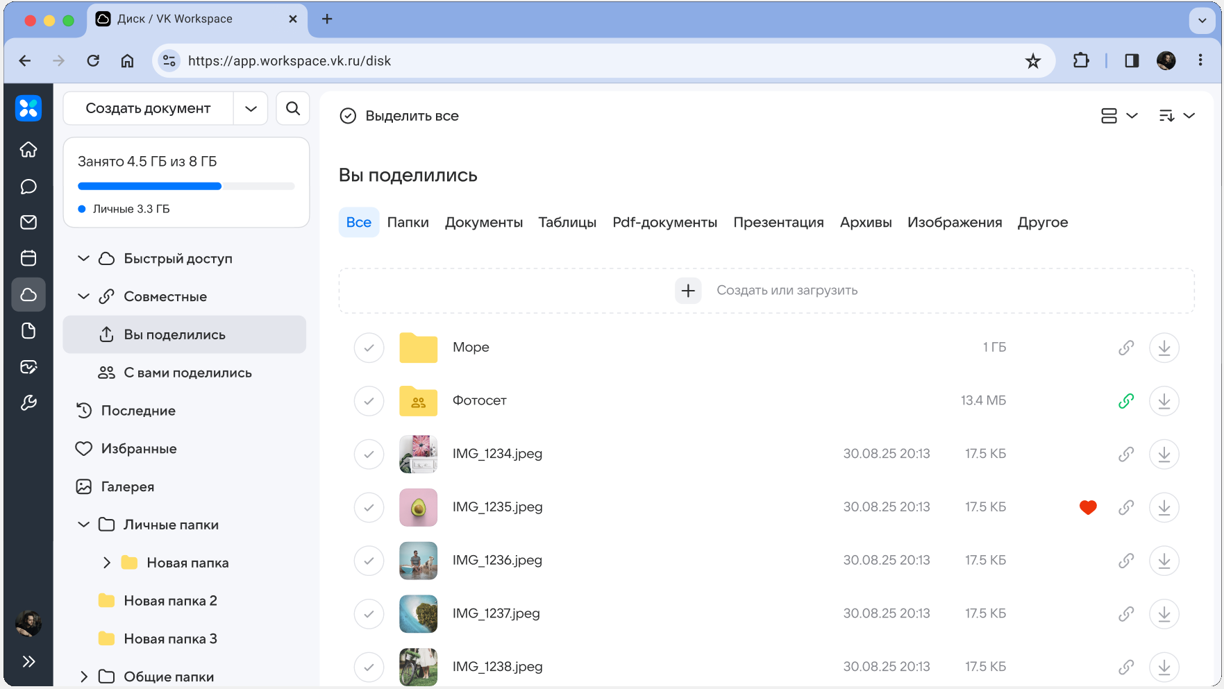 Авторизация выполняется сразу во всех сервисах VK WorkSpace, поэтому просто кликните по значку сервиса в панели слева, чтобы перейти в Почту, Диск, Календарь, Доску и т.д. Пример перехода в Диск: