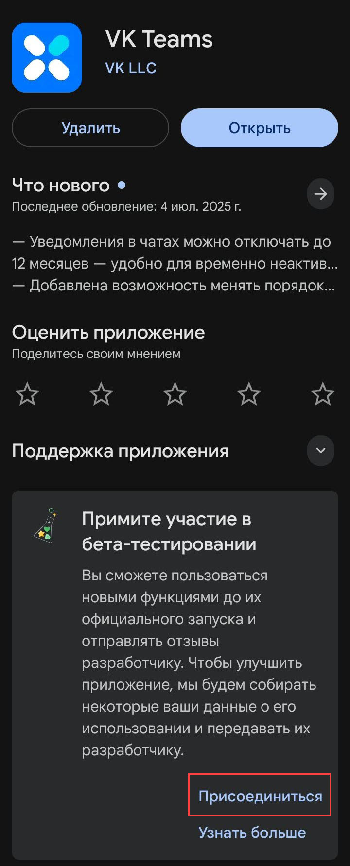 - Откройте VK WorkSpace в Google Play, пролистайте вниз и найдите раздел о бета-тестировании.